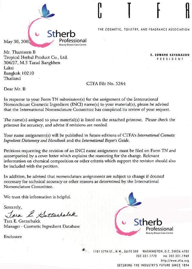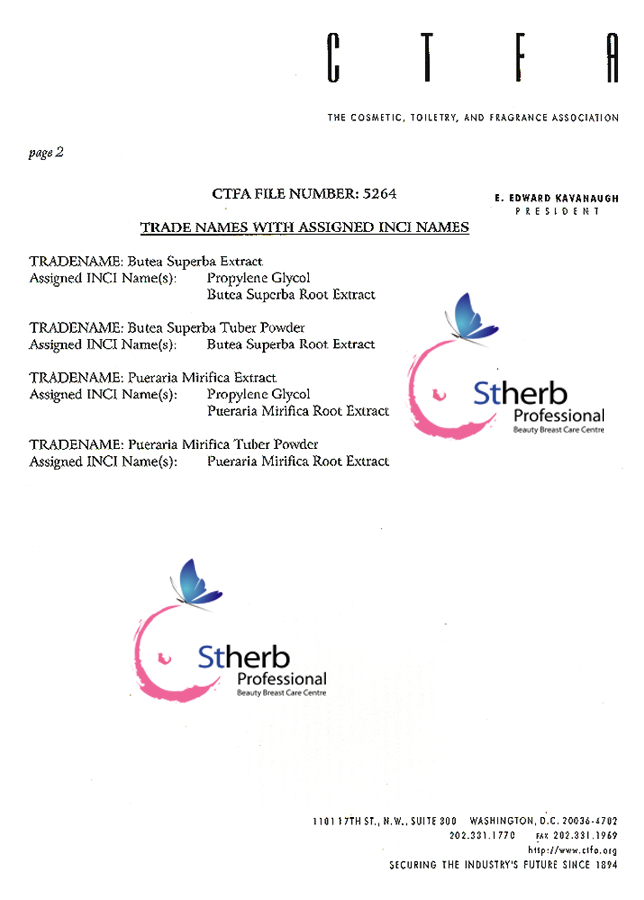CTFA,成立于1894年的全球最权威的化妆品香精香料协会[Securing the industry's future since1894]。泰国圣荷是2002年至今,CTFA唯一推荐的野葛根原料及产品[CTFA手册2003卷2,第707页]。证书[第5264号]
