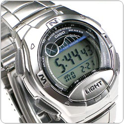 产品参数: 款式:男式 外形:圆形 机芯:电子 表面:高强度玻璃 表壳材质:合成树脂、钢 表盘颜色:液晶 表带材质:钢 表带颜色:银色 表扣:折叠式 防水:100米 功能:计时器、月相器、潮汐计、数字罗盘、电子背光、闹钟、全自动月历、世界城市时间。 产品简介:100米防水、二极管发光(自动背光)、异地时间、罗盘功能、月龄显示、潮汐图、秒表(精确到0.01秒)、倒计时、闹铃、间歇响报、10年电池、全自动日历、12/24小时制。 产品效果图: