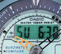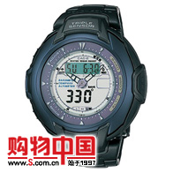购物中国为您提供的商品均为正品原装进口!绝非水货、假货,全国联保,假一赔十! 登山系列——一款为热爱户外运动的冒险家准备的专业腕表太阳能:无需更换电池,便利无忧指针与数字结合,在您操作其他功能时亦可随时掌握时间三个感应器(气压计/数字罗盘/高度计):为您的户外冒险旅程提供安全的数据信息。 【产品功能介绍】 高敏太阳能电池一次足够日照可用2年时间 精确度:每月±15秒 计时功能:时、分、秒、下午(P)、年、月、日、星期 时制:可选换12小时时制及24小时时制显示时间 日历:设有2000年至2039的全自动日历 防水:100米防水 数码罗盘功能:数码罗盘(16个方向) 其他:20秒连续测量;方向值0至359度;校准(双向校准、北向校准) 气压计功能: 测定及显示范围:260至1,100hpa/mb(或7.65至32.45inHg)。 显示单位:1hPa/mb(或0.05inHg) 1hPa=1mb 测定时间:在进入气压计/温度计功能画面后,包括中午及午夜在内,测量会于每日 各偶数小时的整点进行 其他:校准;手动测定(按钮操作);气压图 温度计功能: 测定及显示单位:-10.0℃至60.0℃(或14.0℉至140.0℉) 显示单位:0.1℃(或0.2℉) 测定时间:进入气压计/温度计功能后在最初3分钟内每5秒测定一次 其他:校准;手动测定(按钮操作) 测高计功能: 测定范围:-700至10,000米(-2,300至32,800英尺)无参考高度时 显示范围:-10,000至10,000米(或-32,800至32,800英尺) 显示单位:5米(20英尺) 记忆容量:1组记忆测量资料,包括有41项测定记录(日期、时间、高度)及相对高度、测定时间、最高高度、总上升幅度;累积总上升幅度各项记录 其他:参考高度设定;高度图;高度闹铃 定向传感器的精确度: 方向:在±10度以内 其他:照明(电子荧光板);自动照明功能(Full Auto EL Light只会在黑暗的环境下点亮);电池电量指示符;节电功能(充满电在此状态下计时功能可运作2年);抗低温(-10℃/14℉);
