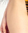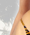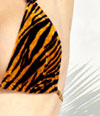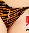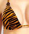 文胸:兼具野性与可爱于一身。狂野的虎纹面料,毛绒爽滑,触感极佳。可调节吊颈带,金属环扣,背部分式系带可扎成精巧的蝴蝶结。三角型罩杯,暴露出迷人的乳沟,勾勒波涛汹涌的胸部曲线。