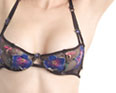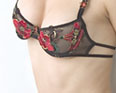 高弹力肩带,可调节,无罩台设计。透明薄纱,性感隐约可见。胸前两枝绣花玫瑰,雅致迷人。三角形底裤,前部为透明薄纱,前部有与文胸同样的精美刺绣玫瑰,更显迷情诱惑。