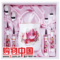 组件:陶瓷勺(16cm)、叉(16cm)、勺叉架共5件。产品把手上配以红色釉下彩镀玫瑰图案。送礼自用两相宜。