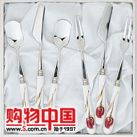组件:陶瓷黄油刀(16cm)、勺(16cm)、叉(16cm)共6件。产品把手上配以红色釉下彩镀玫瑰图案。送礼自用两相宜。