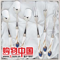 组件:陶瓷勺(16cm)、叉(16cm)共6件。产品把手上配以蓝色釉下彩镀玫瑰图案。送礼自用两相宜。
